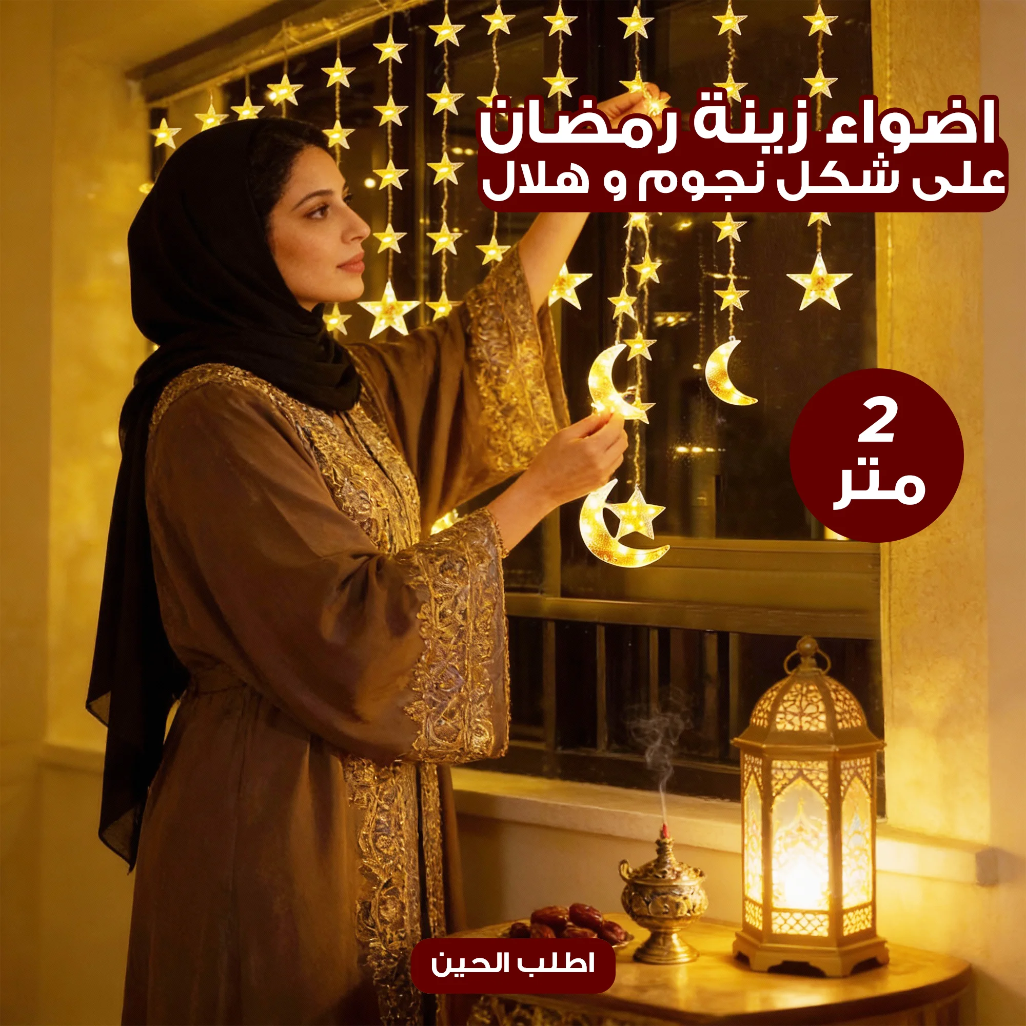 زينة رمضان LED شكل هلال ونجوم (USB + ريموت) – 8 أوضاع إضاءة