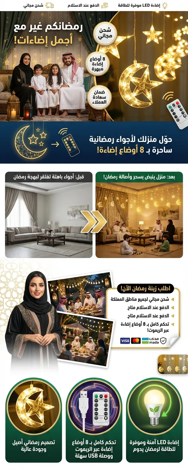 تقدر تحطها في الصالة وقت لمة رمضان، أو بغرفة النوم لإضاءة هادية، أو على الشباك والستارة عشان تعطي شكل أنيق، وحتى بالشرفة أو مدخل البيت لو تبي استقبال مرتب للضيوف. ممتازة بعد للعيد والتصوير والديكور حق المناسبات
